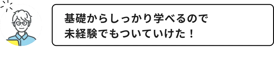 仕事をしながらでも、自分のペースで学習可能!講師の方が個人個人の理解度に応じて親身に教えて下さるので、挫折することなく続けられてます!