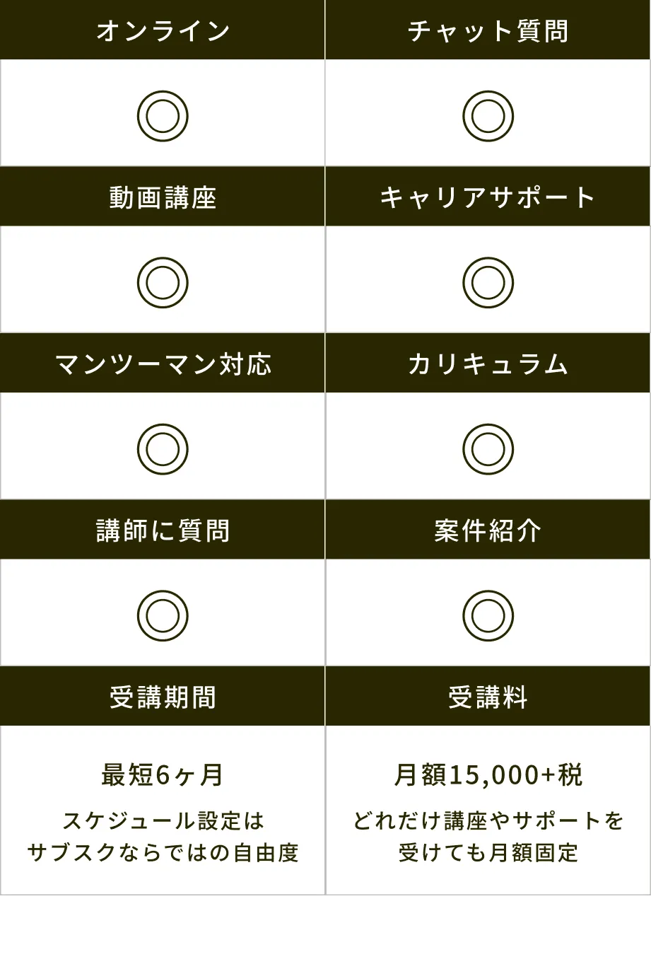 入会して好きな時に動画を見て学べ、分からない事があれば、週2,3回の勉強会に参加し現役のデザイナーからデザイナーの在り方や実践している最先端の情報などを教えてもらえます。課題もあり金銀銅とランクづけのフィードバックで今自分がどの位置かを把握でき、ステップアップへのモチベーションが上がります!